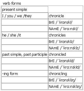 chron·icle [chronicle chronicles chronicled chronicling] noun, verb BrE [ˈkrɒnɪkl] NAmE [ˈkrɑːnɪkl] noun a written record of events in the order in which they happened •the Anglo-Saxon Chronicle •Her latest novel is a chronicle of life in a Devon village. Word Origin: Middle English: from Anglo-Norman French cronicle, variant of Old French cronique, via Latin from Greek khronika ‘annals’, from khronikos ‘of time’, from khronos ‘time’. Derived Word: ↑chronicler verb ~ sth (formal) to record events in the order in which they happened •Her achievements are chronicled in a new biography out this week. Verb forms: Word Origin: Middle English: from Anglo-Norman French cronicle, variant of Old French cronique, via Latin from Greek khronika ‘annals’, from khronikos ‘of time’, from khronos ‘time’. Example Bank: •Her achievements are chronicled in a new biography.
