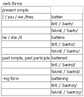 bat·ten [batten battens battened battening] noun, verb BrE [ˈbætn] NAmE [ˈbætn] noun (technical) a long strip of wood that is used to keep other building materials in place on a wall or roof Word Origin: late 15th cent.: from Old French batant, present participle (used as a noun) of batre ‘to beat’, from Latin battuere. Idiom: ↑batten down the hatches Derived: ↑batten on somebody ▪ ↑batten something down verb Verb forms: Word Origin: late 15th cent.: from Old French batant, present participle (used as a noun) of batre ‘to beat’, from Latin battuere.