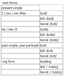 verb (built, builtBrE [bɪlt] ; NAmE [bɪlt] )