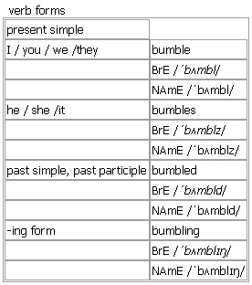 bum·ble [bumble bumbles bumbled bumbling] BrE [ˈbʌmbl] NAmE [ˈbʌmbl] verb intransitive + adv./prep. to act or move in an awkward or confused way •I could hear him bumbling around in the kitchen. Verb forms: Word Origin: late Middle English (in the sense ‘hum, drone’): from ↑boom ‘a loud sound’ + -le.