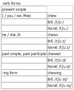 chew [chew chews chewed chewing] verb, noun BrE [tʃuː] NAmE [tʃuː] verb 1. intransitive, transitive to bite food into small pieces in your mouth with your teeth to make it easier to swallow •~ (at/on/through sth) After the operation you may find it difficult to chew and swallow. •~ sth (up) teeth designed for chewing meat • He is always chewing gum. 2. intransitive, transitive to bite sth continuously, for example because you are nervous or to taste it •~ on sth Rosa chewed on her lip and stared at the floor. •The dog was chewing on a bone. •~ sth to chew your nails more at bite off more than you can chew at ↑bite v. Verb forms: Word Origin: Old English cēowan, of West Germanic origin; related to Dutch kauwen and German kauen. Thesaurus: chew verb T, I •Chew your food up well. munch • • gnaw • • nibble • • bite • • crunch • chew/munch/nibble/bite/crunch on sth chew on/gnaw/crunch a bone chew/bite your nails/lip Example Bank: •She was chewing at her lower lip. •The baby chewed on a piece of bread. •Chew your food up well before you swallow it. Idiom: ↑chew the fat Derived: ↑chew somebody out ▪ ↑chew something over noun 1. an act of chewing sth 2. a type of sweet/candy that you chew 3. a piece of ↑tobacco that you chew Word Origin: Old English cēowan, of West Germanic origin; related to Dutch kauwen and German kauen.