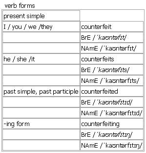 ▪ I. coun·ter·feit [counterfeit counterfeits counterfeited counterfeiting] adjective, verb BrE [ˈkaʊntəfɪt] NAmE [ˈkaʊntərfɪt] adjective (formal) (of money and goods for sale) made to look exactly like sth in order to trick people into thinking that they are getting the real thing Syn: ↑fake •counterfeit watches •Are you aware these notes are counterfeit? Opp: ↑genuine Word Origin: Middle English (as a verb): from Anglo-Norman French countrefeter, from Old French contrefait, past participle of contrefaire, from Latin contra- ‘in opposition’ + facere ‘make’. Example Bank: •He was arrested for attempting to sell counterfeit watches. Derived Word: ↑counterfeiting verb ~ sth (formal) to make an exact copy of sth in order to trick people into thinking that it is the real thing compare ↑forge Verb forms: Word Origin: Middle English (as a verb): from Anglo-Norman French countrefeter, from Old French contrefait, past participle of contrefaire, from Latin contra- ‘in opposition’ + facere ‘make’. ▪ II. coun·ter·feit f29 noun •Despite the introduction of a security shield on the new £10 stamp, counterfeits are costing the postal service millions of pounds a year. compare ↑forgery Main entry: ↑counterfeitderived