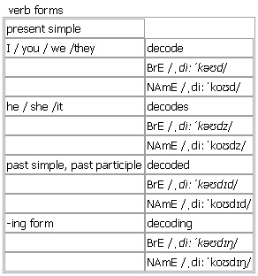 de·code [decode decodes decoded decoding] BrE [ˌdiːˈkəʊd] NAmE [ˌdiːˈkoʊd] verb 1. ~ sth to find the meaning of sth, especially sth that has been written in code Syn: ↑decipher •I was involved in decoding enemy documents. 2. ~ sth to receive an electronic signal and change it into pictures that can be shown on a television screen •decoding equipment 3. ~ sth (linguistics)to understand the meaning of sth in a foreign language compare ↑encode Verb forms: