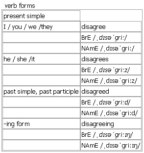 dis·agree [disagree disagrees disagreed disagreeing] BrE [ˌdɪsəˈɡriː] NAmE [ˌdɪsəˈɡriː] verb 1. intransitive if two people disagree or one person disagrees with another about sth, they have a different opinion about it • Even friends disagree sometimes. • No, I disagree. I don't think it would be the right thing to do. •~ (with sb) (about/on/over sth) He disagreed with his parents on most things. •Some people disagree with this argument. •~ that… Few would disagree that students learn best when they are interested in the topic. 2. intransitive if statements or reports disagree, they give different information Opp: ↑agree Derived: ↑disagree with somebody ▪ ↑disagree with with doing something Verb forms: Word Origin: late 15th cent. (in sense 2, also in the sense ‘refuse to agree to’): from Old French desagreer. Thesaurus: disagree verb I •He disagreed with his parents on most things. differ • • dispute • • be at odds • • not see eye to eye with sb • |formal take issue with sb • Opp: agree disagree/differ/dispute/be at odds/not see eye to eye/take issue with sb/sth disagree/differ/be at odds/not see eye to eye/take issue on sth disagree/differ/be at odds/take issue over sth Disagree or differ? Only people can disagree; people or their opinions can differ: •Medical opinion differs as to how to treat the disease. ✗ Medical opinion disagrees as to how to treat the disease. Example Bank: •He and I simply disagree. •I disagree strongly with this idea. •I disagree totally with this policy. •I feel uncomfortable publicly disagreeing with a colleague. •I flatly disagree with that policy. •I must respectfully disagree with her on this point. •I personally disagreed with several elements of the proposal. •It is difficult to disagree with the chairman on this point. •Jack and Robert disagree about everything. •Many in the government disagree over the scale of the changes. •Ministers disagree over the scale of the changes. •The only time we sharply disagreed was over the children's education. •Victoria and I obviously disagree on this issue. •We disagree on this matter. •When I pointed out that it had been her idea in the first place, she could hardly disagree. •No, I disagree. I don't think it would be the right thing to do. •She disagreed that building more roads was the only way to handle traffic congestion.