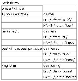 dis·in·ter [disinter disinterred disinterring] BrE [ˌdɪsɪnˈtɜː(r)] NAmE [ˌdɪsɪnˈtɜːr] verb (-rr-)(formal) 1. ~ sth to dig up sth, especially a dead body, from the ground Opp: ↑inter 2. ~ sth (from sth) to find sth that has been hidden or lost for a long time Verb forms: Word Origin: early 17th cent.: from French désenterrer, from dis- (expressing reversal) + enterrer ‘to inter’.