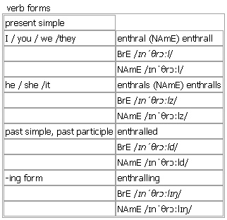 en·thral [enthral enthrals enthralled enthralling] (BrE) (NAmE en·thrall)BrE [ɪnˈθrɔːl] NAmE [ɪnˈθrɔːl] verb (-ll-)transitive, intransitive, usually passive ~ (sb) if sth enthrals you, it is so interesting, beautiful, etc. that you give it all your attention Syn: ↑entrance •The child watched, enthralled by the bright moving images. •This book will enthral readers of all ages. Derived Word: ↑enthralling Verb forms: Word Origin: late Middle English (in the sense ‘enslave’; formerly also as inthrall): from ↑en-, ↑in- (as an intensifier) + ↑thrall. Example Bank: •It promises to be a most enthralling debate. •What was it about Sandra that Dr King found so enthralling? Example Bank: •The children listened enthralled as the storyteller unfolded her tale. •They were enthralled with the play.