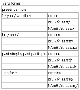 ▪ I. ex·cise 1 [excise excises excised excising] BrE [ˈeksaɪz] NAmE [ˈeksaɪz] noun uncountable a government tax on some goods made, sold or used within a country •new excise duties on low-alcohol drinks •a sharp increase in vehicle excise •an excise officer (= an official whose job is to collect ↑excise ) compare ↑customs Word Origin: late 15th cent. ‘a tax or toll’ Middle Dutch excijs accijs Latin accensare ‘to tax’ ad- ‘to’ census ‘tax’ ↑census Example Bank: •the excise levied on beer and tobacco •to increase the excise on whisky •There are new excise duties on alcoholic drinks. •There has been a sharp increase in vehicle excise. ▪ II. ex·cise 2 [excise excises excised excising] BrE [ɪkˈsaɪz] NAmE [ɪkˈsaɪz] verb ~ sth (from sth) (formal) to remove sth completely •Certain passages were excised from the book. Verb forms: Word Origin: late 16th cent. ‘notch or hollow out’ Latin excis- ‘cut out’ excidere ex- ‘out of’ caedere ‘to cut’ Example Bank: •He carefully excised any passages that might cause offence. •The sensor improves the precision with which surgeons can excise brain tumours.
