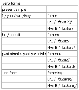 father [father fathers fathered fathering] noun, verb BrE [ˈfɑːðə(r)] NAmE [ˈfɑːðər] noun 1. a male parent of a child or an animal; a person who is acting as the father to a child • Ben's a wonderful father. • You've been like a father to me. •Our new boss is a father of three (= he has three children). •He was a wonderful father to both his natural and adopted children. • (old-fashioned)Father, I cannot lie to you. see also ↑godfather, ↑grandfather, ↑stepfather 2. fathersplural (literary)a person's ↑ancestors (= people who are related to you who lived in the past) •the land of our fathers see also ↑forefathers 3. ~ (of sth) the first man to introduce a new way of thinking about sth or of doing sth •Henry Moore is considered to be the father of modern British sculpture. see also ↑founding father 4. Fatherused by Christians to refer to God •Father, forgive us. •God the Father 5. Father (abbr.Fr)the title of a priest, especially in the Roman Catholic Church and the Orthodox Church •Father Dominic see also ↑Holy Father more at old enough to be sb's father/mother at ↑old, the wish is father to the thought at ↑wish n. Word Origin: Old English fæder, of Germanic origin; related to Dutch vader and German Vater, from an Indo-European root shared by Latin pater and Greek patēr. Thesaurus: father noun C •Gary's a wonderful father. parent • • stepfather • • guardian • |informal, especially spoken dad • • daddy • |especially AmE, informal folks • a good/bad/caring/loving father/parent/dad take after/inherit sth from your father/parents/dad/daddy become a/sb's father/parent/stepfather/guardian/dad Father or dad? In spoken English dad is much more frequent. It can sound formal to say my father. Example Bank: •Boland, a father of two, was arrested on charges of theft. •Elena's brother was a surrogate father to her kids after her husband died. •He followed in his father's footsteps and became a motor mechanic. •He followed the footsteps of his famous father into the film industry. •He had a domineering mother and a cold, distant father. •He has an ailing father and two younger brothers to support. •He has just become the proud father of a baby girl. •He is very good with children and would make a devoted father. •He paced like an expectant father. •He succeeded his father as Professor of Botany. •He was a wonderful father to her. •He was both a bad husband and a bad father. •I always thought of you as a second father. •I buried my father, and mourned his death. •I lost my father when I was nine. •Jesse is now married and father to a young son. •Meet your new father. •Ryan has gone looking for his long-lost father. •She followed her father into the legal profession. •She inherited the urge to travel from her father. •She kept the books that had belonged to her beloved father. •Some of his students regard him as a father figure. •The land passes on from father to son. •The new father took his son into his arms. •The two boys were like their mother in character, but Louise took after her father. •Their musician father encouraged their love of music. •Try your best to honor your father. •a married father of two •the grieving father of two children lost at sea •Ben's a wonderful father. •Our new boss is a father of three. •You've been like a father to me. Idioms: ↑from father to son ▪ ↑like father, like son verb 1. ~ sb to become the father of a child by making a woman pregnant •He claims to have fathered over 20 children. 2. ~ sth to create new ideas or a new way of doing sth Verb forms: Word Origin: Old English fæder, of Germanic origin; related to Dutch vader and German Vater, from an Indo-European root shared by Latin pater and Greek patēr.