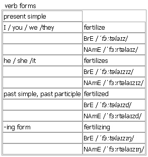 fer·til·ize (BrE also-ise) [fertilize fertilizes fertilized fertilizing] BrE [ˈfɜːtəlaɪz] NAmE [ˈfɜːrtəlaɪz] verb 1. ~ sth to put ↑pollen into a plant so that a seed develops; to join ↑sperm with an egg so that a baby or young animal develops •Flowers are often fertilized by bees as they gather nectar. •a fertilized egg 2. ~ sth to add a substance to soil to make plants grow more successfully Derived Word: ↑fertilization Verb forms: