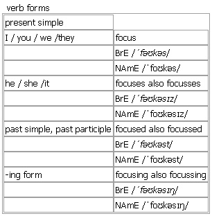 focus AW [focus focuses focusses focused focussed focusing focussing] verb, noun BrE [ˈfəʊkəs] NAmE [ˈfoʊkəs]