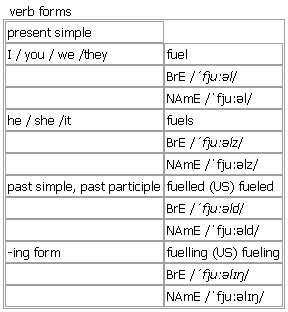 fuel [fuel fuels fuelled fueled fuelling fueling] noun, verb BrE [ˈfjuːəl] NAmE [ˈfjuːəl] noun 1. uncountable, countable any material that produces heat or power, usually when it is burnt •solid fuel (= wood, coal, etc.) •nuclear fuels •a car with high fuel consumption • Domestic fuel bills are set to rise again in the autumn. see also ↑fossil fuel 2. uncountable a thing that is said or done that makes sth, especially an argument, continue or get worse • The new information adds fuel to the debate over safety procedures. •The revelations gave new fuel to angry opponents of the proposed law. •His remarks simply added fuel to the fire/flames of her rage. Word Origin: Middle English: from Old French fouaille, based on Latin focus ‘hearth’ (in late Latin ‘fire’). Thesaurus: fuel noun U, C •Fuel bills are set to rise again. oil • • gas • • coal • • fossil fuel • • diesel • • petroleum • |BrE petrol • |AmE gasoline • sth runs on (a particular kind of) fuel/oil/gas/diesel/petrol/gasoline run out of fuel/oil/gas/diesel/petrol fuel/oil/gas/coal/fossil fuel/diesel/petroleum/petrol/gasoline consumption Example Bank: •The plant reprocesses spent fuel from nuclear power stations. •The power plant burns sugar cane as fuel. •The power plant burns used vehicle tyres as fuel. •What sort of fuel does the car run on? •a car with high fuel consumption •power stations which burn fossil fuels •A tax on carbon-producing fuels such as coal and oil was proposed. •Domestic fuel bills are set to rise again this winter. •It will be necessary to reduce fuel consumption by 15%. •Make sure you don't run out of fuel. •Most of the houses are heated with solid fuel. verb (-ll-, US -l-) 1. transitive ~ sth to supply sth with material that can be burnt to produce heat or power •Uranium is used to fuel nuclear plants. •oil-fuelled power stations 2. transitive, intransitive ~ (sth) (up) to put petrol/gas into a vehicle •The helicopter was already fuelled (up) and ready to go. 3. transitive ~ sth to increase sth; to make sth stronger Syn: ↑stoke •to fuel speculation/rumours/fears •Higher salaries helped to fuel inflation. Verb forms: Word Origin: Middle English: from Old French fouaille, based on Latin focus ‘hearth’ (in late Latin ‘fire’). Example Bank: •Crime is soaring fuelled by an influx of drugs. •Higher oil prices helped to fuel inflation. •His absence has fuelled rumours of a split within the party. •The consumer boom had been fuelled by a credit-led economy. •Yesterday's meeting is likely to fuel further speculation about a takeover.