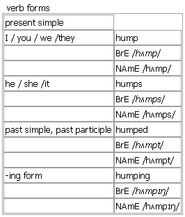 hump [hump humps humped humping] noun, verb BrE [hʌmp] NAmE [hʌmp]