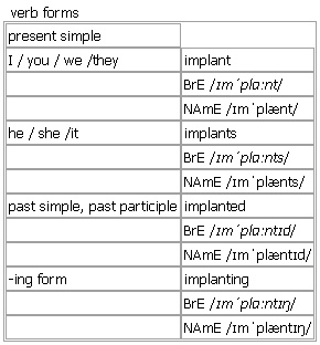 im·plant [implant implants implanted implanting] verb, noun verb BrE [ɪmˈplɑːnt] ; NAmE [ɪmˈplænt] 1. transitive ~ sth (in/into sth) to fix an idea, attitude, etc. firmly in sb's mind •Prejudices can easily become implanted in the mind. 2. transitive ~ sth (in/into sth) to put sth (usually sth artificial) into a part of the body for medical purposes, usually by means of an operation •an electrode implanted into the brain •So far, only one person has survived an operation to implant an artificial heart. compare ↑transplant 3. intransitive ~ (in/into sth) (of an egg or an ↑embryo)to become fixed inside the body of a person or an animal so that it can start to develop •The embryo is placed into the uterus where it has a chance to implant. Verb forms: Word Origin: late Middle English: from late Latin implantare ‘graft’, from Latin in- ‘into’ + plantare ‘to plant’. Derived Word: ↑implantation noun BrE [ˈɪmplɑːnt] ; NAmE [ˈɪmplænt] something that is put into a person's body in a medical operation •silicone breast implants compare ↑transplant Word Origin: late Middle English: from late Latin implantare ‘graft’, from Latin in- ‘into’ + plantare ‘to plant’.