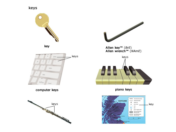 key [key keys keyed keying] noun, verb, adjective BrE [kiː] NAmE [kiː] noun TOOL FOR LOCK 1. a specially shaped piece of metal used for locking a door, starting a car, etc •to insert/turn the key in the lock •the car keys •a bunch of keys •the spare key to the front door • We'll have a duplicate key cut (= made). • There's a special key for winding up this clock. MOST IMPORTANT THING 2. usually singular a thing that makes you able to understand or achieve sth Syn: ↑secret •~ (to sth) The key to success is preparation. •~ (to doing sth) The driver of the car probably holds the key to solving the crime. • (especially NAmE)The key is, how long can the federal government control the inflation rate? ON COMPUTER 3. any of the buttons that you press to operate a computer or ↑typewriter • Press the return key to enter the information. ON MUSICAL INSTRUMENT 4. any of the wooden or metal parts that you press to play a piano and some other musical instruments MUSIC 5. a set of related notes, based on a particular note. Pieces of music are usually written mainly using a particular key •a sonata in the key of E flat major • This piece changes key many times. compare ↑scale n. (7) ANSWERS 6. a set of answers to exercises or problems • Check your answers in the key at the back of the book. ON MAP 7. an explanation of the symbols used on a map or plan see also ↑low-key, see under lock and key at ↑lock n. Word Origin: Old English cǣg, cǣge, of unknown origin. Thesaurus: key noun 1. C, usually sing. •The key to success is preparation. answer • • solution • the key/answer/solution to sth look for/find/provide/offer the key/an answer/a solution 2. C •Press the return key. button • • switch • • control • a key/button/switch on sth a control key/button/switch press/hit a key/button/switch Example Bank: •Can we try it in a lower key? •F1 is the short-cut key for calling up help. •First-time voters could hold the key to the election result. •He fished a ring of keys out of his pocket. •Hold down the Alt key while pressing the arrow keys. •I slid the key into the lock and went in. •I'd accidentally locked the keys in my car. •I'll get another key cut so that you can have one. •Language is the key to understanding those around you. •Robbie didn't have a key for these doors. •She hides a front door key in a flowerpot. •She left a key with the neighbours/neighbors. •She must have used a key to get in. •The key changes from C major to A minor. •The key tells you what all the symbols mean. •The piece changes key in the middle. •The sound of keys jangling caught her attention. •There are two sharps in the key signature of D major. •They heard a key turn in the back door lock. •What key is it in? •You can find the symbols in the key at the bottom of the page. •You have to close it with the key. •You need a key to open the garage. •a large bunch of keys •a set of car keys •the key of G major •the key to the front door •the key to the signs and symbols •the top row of keys •His hands flew over the piano keys and beautiful sounds filled the theatre. •The key is, how long can the federal government control the inflation rate? •The sonata was written in the key of E flat major. Derived: ↑key somebody to something verb 1. ~ sth (in) | ~ sth (into sth) to put information into a computer using a keyboard Syn: ↑enter •Key (in) your password. 2. to deliberately damage a car by scratching it with a key Verb forms: Word Origin: Old English cǣg, cǣge, of unknown origin. adjective usually before noun most important; essential Syn: ↑critical, Syn: ↑vital •the key issue/factor/point • He was a key figure in the campaign. • She played a key role in the dispute. •‘Caution’ is the key word in this situation. •Good communication is key to our success. •His contribution could be key. Word Origin: Old English cǣg, cǣge, of unknown origin. Thesaurus: key adj. usually before noun •The key issue is taxation. main • • major • • essential • • central • • principal • • prime • • primary • • chief • • predominant • |informal number one • Opp: secondary be key/essential/central to sth the key/main/major/essential/central/principal/prime/primary/chief/predominant purpose/source/factor the key/main/major/essential/central/principal/prime/primary/chief aim/function/objective/task/consideration Synonyms: main major • key • central • principal • chief • prime These words all describe sb/sth that is the largest or most important of its kind. main • [only before noun] largest or most important: ▪ Be careful crossing the main road. ◇ ▪ The main thing is to remain calm. major • [usually before noun] very large or important: ▪ He played a major role in setting up the system. Major is most often used after a with a singular noun, or no article with a plural noun. When it is used with the or my/your/his/her/our/their it means ‘the largest or most important’: ▪ Our major concern here is combatting poverty. In this meaning it is only used to talk about ideas or worries that people have, not physical things, and it is also more formal than main: Be careful crossing the major road. ◇ The major thing is to remain calm. key • [usually before noun] most important; essential: ▪ He was a key figure in the campaign. Key is used most frequently in business and political contexts. It can be used to talk about ideas, or the part that sb plays in a situation, but not physical things. It is slightly more informal than major, especially when used after a noun and linking verb: ▪ Speed is key at this point. central • (rather formal) most important: ▪ The central issue is that of widespread racism. Central is used in a similar way to key, but is more formal. It is most frequently used in the phrase sth is central to sth else. principal • [only befo