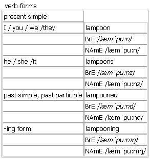 lam·poon [lampoon lampoons lampooned lampooning] verb, noun BrE [læmˈpuːn] NAmE [læmˈpuːn] verb ~ sb/sth to criticize sb/sth publicly in an amusing way that makes them or it look ridiculous Syn: ↑satirize •His cartoons mercilessly lampooned the politicians of his time. Verb forms: Word Origin: mid 17th cent.: from French lampon, said to be from lampons ‘let us drink’ (used as a refrain), from lamper ‘gulp down’, nasalized form of laper ‘to lap (liquid)’. noun a piece of writing that criticizes sb/sth and makes them or it look ridiculous •Such lampoons of royalty were previously found only in the foreign press. Word Origin: mid 17th cent.: from French lampon, said to be from lampons ‘let us drink’ (used as a refrain), from lamper ‘gulp down’, nasalized form of laper ‘to lap (liquid)’.