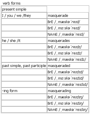mas·quer·ade [masquerade masquerades masqueraded masquerading] noun, verb BrE [ˌmæskəˈreɪd] BrE [ˌmɑːskəˈreɪd] NAmE [ˌmæskəˈreɪd]