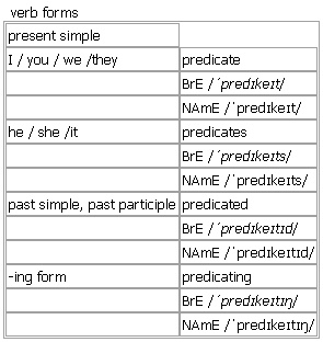 predi·cate [predicate predicates predicated predicating] noun, verb noun BrE [ˈpredɪkət] ; NAmE [ˈpredɪkət] (grammar) a part of a sentence containing a verb that makes a statement about the subject of the verb, such as went home in John went home. compare ↑object n. (5) Word Origin: late Middle English (as a noun): from Latin praedicatum ‘something declared’, neuter of praedicatus ‘declared, proclaimed’, past participle of the verb praedicare, from prae ‘beforehand’ + dicare ‘make known’. verb BrE [ˈpredɪkeɪt] ; NAmE [ˈpredɪkeɪt] (formal) 1. usually passive ~ sth on/upon sth to base sth on a particular belief, idea or principle •Democracy is predicated upon the rule of law. 2. ~ that… | ~ sth to state that sth is true •The article predicates that the market collapse was caused by weakness of the dollar. Verb forms: Word Origin: late Middle English (as a noun): from Latin praedicatum ‘something declared’, neuter of praedicatus ‘declared, proclaimed’, past participle of the verb praedicare, from prae ‘beforehand’ + dicare ‘make known’.