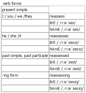 re·assess AW [reassess reassesses reassessed reassessing] BrE [ˌriːəˈses] NAmE [ˌriːəˈses] verb ~ sth to think again about sth to decide if you need to change your opinion of it Syn: ↑reappraise •After reassessing the situation, she decided to do nothing. Derived Word: ↑reassessment Verb forms:
