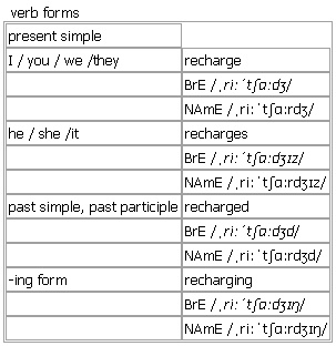 re·charge [recharge recharges recharged recharging] BrE [ˌriːˈtʃɑːdʒ] NAmE [ˌriːˈtʃɑːrdʒ] verb 1. transitive, intransitive ~ (sth) to fill a battery with electrical power; to be filled with electrical power •He plugged his razor in to recharge it. •The drill takes about three hours to recharge. 2. intransitive (informal)to get back your strength and energy by resting for a time •We needed the break in order to recharge. Idiom: ↑recharge your batteries Derived Word: ↑rechargeable Verb forms:
