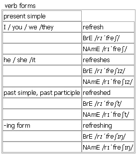 re·fresh [refresh refreshes refreshed refreshing] BrE [rɪˈfreʃ] NAmE [rɪˈfreʃ] verb 1. transitive ~ sb/yourself to make sb feel less tired or less hot •The long sleep had refreshed her. •The following morning she awoke refreshed. •He refreshed himself with a cool shower. 2. transitive ~ sth (informal, especially NAmE)to fill sb's glass or cup again •Let me refresh your glass. •He went into the kitchen to refresh their drinks. 3. transitive ~ your/sb's memory to remind yourself/sb of sth, especially with the help of sth that can be seen or heard Syn: ↑jog •He had to refresh his memory by looking at his notes. 4. transitive, intransitive ~ (sth) (computing)to get the most recent information, for example on an Internet page, by clicking on a button on the screen •Click here to refresh this document. •The page refreshes automatically. Verb forms: Word Origin: late Middle English: from Old French refreschier, from re- ‘back’ + fres(che) ‘fresh’.