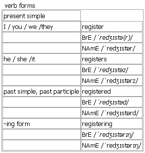 regis·ter AW [register registers registered registering] verb, noun BrE [ˈredʒɪstə(r)] NAmE [ˈredʒɪstər] verb PUT NAME ON LIST 1. transitive, intransitive to record your/sb's/sth's name on an official list •~ sth to register a birth/marriage/death •to register a company/trademark •~ sth in sth The ship was registered in Panama. •~ sb + adj. | ~ (sb) as sth She is officially registered (as) disabled. •~ (with sb/sth) to register with a doctor •~ (at/for sth) to register at a hotel GIVE OPINION PUBLICLY 2. transitive ~ sth (formal)to make your opinion known officially or publicly • China has registered a protest over foreign intervention. ON MEASURING INSTRUMENT 3. intransitive (+ noun) if a measuring instrument registers an amount or sth registers an amount on a measuring instrument, the instrument shows or records that amount • The thermometer registered 32°C. • The earthquake registered 3 on the Richter scale. •The stock exchange has registered huge losses this week. SHOW FEELING 4. transitive, no passive, intransitive ~ (sth) (formal)to show or express a feeling •Her face registered disapproval. •Shock registered on everyone's face. NOTICE STH 5. transitive, no passive, intransitive (often used in negative sentences)~ (sth) to notice sth and remember it; to be noticed •He barely registered our presence. •I told her my name, but it obviously didn't register. LETTER/PACKAGE 6. transitive, usually passive ~ sth to send sth by mail, paying extra money to protect it against loss or damage •Can I register this, please? •a registered letter Verb forms: Word Origin: late Middle English: from Old French regestre or medieval Latin regestrum, registrum, alteration of regestum, singular of late Latin regesta ‘things recorded’, from regerere ‘enter, record’. Thesaurus: register verb T, I •All students must be registered with a local doctor. •The company's logo has been registered as a trademark. record • • enter • • log • |especially BrE enrol • |AmE usually enroll • register/record/enter/log/enrol sb/sth as sth register/record/enter/enrol sb/sth in sth register/record/enter/log the details of sth Example Bank: •About 68 per cent of illegitimate births were jointly registered by both parents. •As I reached my eighteenth birthday I duly registered for military service. •He registered at his local university. •He vaguely registered that the women had gone. •His eyes failed to register Meredith's surprise. •On completion of the preregistration year, graduates become fully registered by the General Medical Council. •Players must register online before playing the game. •She had barely registered his presence. •Slowly, my mind began to register where I was: in the hospital. •Students living away from home are required to register with a local doctor. •The pain that stung her hand did not seem to register. •The words registered slowly in her mind. •There is still time to register for English classes. •They had not properly registered as required by state law. •You must register the death within three days. •the number of people officially registering as unemployed •the preferences of newly registered voters •All students must be registered with a local doctor. •Many older people have registered for a postal vote. •Not all firms are registered for VAT. •Only 2% of the workforce was registered as unemployed. •The company's logo has not yet been registered as a trademark. •Visitors to the country had to register with the police. •You need to go to the Registrar's Office to register the death. noun LIST OF NAMES 1. countable an official list or record of names, items, etc; a book that contains such a list •a parish register (= of births, marriages and deaths) •to be on the electoral register/register of voters • Could you sign the hotel register please, sir? • (BrE) The teacher called the register (= checked who was present at school). OF VOICE/INSTRUMENT 2. countable the range, or part of a range, of a human voice or a musical instrument •in the upper/middle/lower register OF WRITING/SPEECH 3. countable, uncountable (linguistics)the level and style of a piece of writing or speech, that is usually appropriate to the situation that it is used in •The essay suddenly switches from a formal to an informal register. FOR HOT/COLD AIR 4. countable (NAmE)an opening, with a cover that you can have open or shut, that allows hot or cold air from a heating or cooling system into a room compare ↑vent MACHINE 5. countable (NAmE) = ↑cash register Word Origin: late Middle English: from Old French regestre or medieval Latin regestrum, registrum, alteration of regestum, singular of late Latin regesta ‘things recorded’, from regerere ‘enter, record’. Thesaurus: register noun C •Could you sign the hotel register, please? list • • listing • • roll • • index • • directory • • catalogue • • inventory • in a/an register/list/listing/index/directory/catalogue/inventory on a/an register/list/roll/inventory compile a/an register/list/index/directory/inventory keep a/an register/list/index/inventory Example Bank: •CEOs who were listed in a social register •Dr Shaw was struck off the medical register for misconduct. •He has adopted an informal register so as not to alienate his audience. •He has been placed on the sex offenders' register. •It was the last entry in the register. •She was asked to draw up a register of suitable sites. •The Leas married in a register office. •The bride and bridegroom signed the register. •The teacher takes the register at the beginning of each class. •Their names had been entered in the register as owners of the company. •There are 36 children on the register. •They keep a register of all those who have contributed to the fund. •a register containing details of four million cars •boy trebles singing in high regist