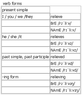 re·lieve [relieve relieves relieved relieving] BrE [rɪˈliːv] NAmE [rɪˈliːv] verb 1. ~ sth to remove or reduce an unpleasant feeling or pain •to relieve the symptoms of a cold •to relieve anxiety/guilt/stress •Being able to tell the truth at last seemed to relieve her. 2. ~ sth to make a problem less serious Syn: ↑alleviate •efforts to relieve poverty •to relieve traffic congestion 3. ~ sth to make sth less boring, especially by introducing sth different •We played cards to relieve the boredom of the long wait. •The black and white pattern is relieved by tiny coloured flowers. 4. ~ sb to replace sb who is on duty •to relieve a sentry •You'll be relieved at six o'clock. 5. ~ sth to free a town, etc. from an enemy army that has surrounded it 6. ~ yourself a polite way of referring to going to the toilet •I had to relieve myself behind a bush. Derived: ↑relieve somebody of something Verb forms: Word Origin: Middle English: from Old French relever, from Latin relevare, from re- (expressing intensive force) + levare ‘raise’ (from levis ‘light’). Example Bank: •Respite care is intended to relieve parents of the burden of caring for disabled children. •They try to relieve the symptoms of depression by drinking. •trying to relieve the symptoms of depression •Aid workers called for further effort from governments to relieve the famine. •Don't resort to alcohol to relieve stress. •Take painkillers and hot drinks to relieve the symptoms. •You'll be relieved at 6 o'clock. •to relieve a driver/sentry