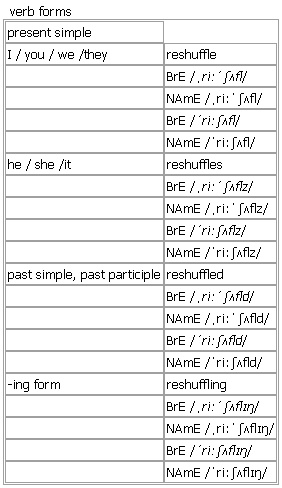 I. re·shuf·fle [reshuffle reshuffles reshuffled reshuffling] BrE [ˌriːˈʃʌfl] NAmE [ˌriːˈʃʌfl] (also less frequent shuf·fle) verb transitive, intransitive ~ (sth)