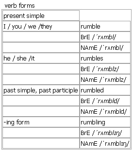 rum·ble [rumble rumbles rumbled rumbling] verb, noun BrE [ˈrʌmbl] NAmE [ˈrʌmbl] verb 1. intransitive to make a long deep sound or series of sounds •The machine rumbled as it started up. •thunder rumbling in the distance •I'm so hungry my stomach's rumbling. 2. intransitive + adv./prep. to move slowly and heavily, making a rumbling sound •tanks rumbling through the streets •The train rumbled nearer. 3. transitive ~ sb (BrE, informal)to discover the truth about sb or what they are trying to hide •They knew they had been rumbled. 4. intransitive (NAmE, informal) (of a ↑gang of young people)to fight against another ↑gang Verb forms: Word Origin: late Middle English: probably from Middle Dutch rommelen, rummelen, of imitative origin. Sense 3 of the verb may be a different word. Thesaurus: rumble verb I •Thunder rumbled in the distance. boom • • thunder • • roar • • roll • thunder rumbles/booms/roars/rolls traffic rumbles/thunders/roars rumble/boom/thunder/roar/roll loudly Example Bank: •My stomach rumbled noisily. •I'm so hungry my stomach's rumbling. •They could hear thunder rumbling in the distance. Derived: ↑rumble on noun 1. uncountable, countable ~ (of sth) a long deep sound or series of sounds •the rumble of thunder •Inside, the noise of the traffic was reduced to a distant rumble. • (figurative)Although an agreement has been reached, rumbles of resentment can still be heard. 2. countable (NAmE, informal)a fight in the street between two or more ↑gangs (= groups of young people) Word Origin: late Middle English: probably from Middle Dutch rommelen, rummelen, of imitative origin. Sense 3 of the verb may be a different word. Example Bank: •We could hear the distant rumble of thunder. •He gave a low rumble of laughter. •There was an ominous rumble of thunder from the approaching storm.