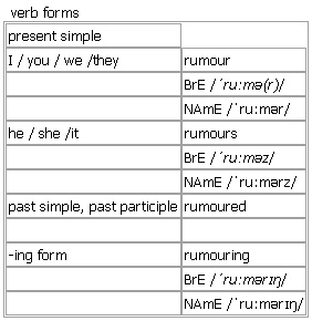 ru·mour [rumour rumours rumoured rumouring] (especially US rumor)noun, verb BrE [ˈruːmə(r)] NAmE [ˈruːmər] noun countable, uncountable a piece of information, or a story, that people talk about, but that may not be true •to start/spread a rumour •~ (of sth) There are widespread rumours of job losses. •~ (about sth) Some malicious rumours are circulating about his past. •~ (that…) I heard a rumour that they are getting married. •Many of the stories are based on rumour. •Rumour has it (= people say) that he was murdered. •I thought she was leaving the company, but perhaps it may be just a rumour. Word Origin: late Middle English: from Old French rumur, from Latin rumor ‘noise’. Thesaurus: rumour (BrE) (AmE rumor)noun C, U •There are widespread rumours of job losses. report • • talk • • hearsay • |informal dirt • |sometimes disapproving scandal • • gossip • rumours/reports/talk/hearsay/dirt/scandal/gossip about sb/sth rumours/reports/talk of sth happening spread rumours/reports/gossip hear/believe rumours/reports/talk/gossip deny/confirm rumours/reports Example Bank: •His lengthy absence from work fuelled rumours that he might have been sacked. •His lengthy absence will fuel rumours that he has been fired. •Rumour has it that he was sacked from his last job. •Rumours about an impending divorce were rife. •The Chief Executive issued a statement to quash rumours of financial problems. •The Washington rumour mill suggests the money changed hands illegally. •The actor confirmed rumours that he will be leaving the series. •The manager resigned suddenly amidst rumours of misconduct. •The rumour quickly swept the town. •There is no truth in the rumour that she is about to resign. •There were persistent rumours of drug taking among staff. •rumours surrounding the closure of the hospital •Rumour has it that he was murdered. Derived Word: ↑rumoured verb be rumoured to be reported as a rumour and possibly not true •it is rumoured that… It's widely rumoured that she's getting promoted. •~ to be/have sth He was rumoured to be involved in the crime. Verb forms: Word Origin: late Middle English: from Old French rumur, from Latin rumor ‘noise’. Example Bank: •It is widely rumoured that she is considering a divorce.