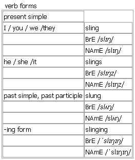 sling [sling slings slung slinging] verb, noun BrE [slɪŋ] NAmE [slɪŋ] verb (slung, slungBrE [slʌŋ] ; NAmE [slʌŋ] ) 1. (informal, especially BrE)to throw sth somewhere in a careless way Syn: ↑chuck •~ sth + adv./prep. Don't just sling your clothes on the floor. •She slung her coat into the back of the car. •~ sb sth Sling me an apple, will you? see also ↑mud-slinging 2. often passive ~ sth + adv./prep. to put sth somewhere where it hangs loosely •Her bag was slung over her shoulder. •We slung a hammock between two trees. 3. often passive ~ sb + adv./prep. (informal)to put sb somewhere by force; to make sb leave somewhere •They were slung out of the club for fighting. •They were slung into prison. Verb forms: Word Origin: Middle English: probably from Low German, of symbolic origin; compare with German Schlinge ‘noose, snare’. Sense 1 of the verb is from Old Norse slyngva. Example Bank: •He slung his arm around my shoulders. •His jacket was carelessly slung over one shoulder. •She slung her bag over her shoulder. Idiom: ↑sling your hook Derived: ↑sling off at somebody noun 1. a band of cloth that is tied around a person's neck and used to support a broken or injured arm •He had his arm in a sling. 2. a device consisting of a band, ropes, etc. for holding and lifting heavy objects •The engine was lifted in a sling of steel rope. 3. a device like a bag for carrying a baby on your back or in front of you 4. (in the past) a simple weapon made from a band of leather, etc, used for throwing stones Syn: ↑catapult Word Origin: Middle English: probably from Low German, of symbolic origin; compare with German Schlinge ‘noose, snare’. Sense 1 of the verb is from Old Norse slyngva.