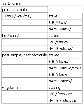 stave [stave staves staved stove staving] noun, verb BrE [steɪv] NAmE [steɪv] noun 1. a strong stick or pole •fence staves 2. (BrE) (also staff NAmE, BrE) (music)a set of five lines on which music is written Word Origin: Middle English: back-formation from staves, archaic plural of ↑staff. Current senses of the verb date from the early 17th cent. Derived: ↑stave something in ▪ ↑stave something off verb (staved, stavedor stove, stoveBrE [stəʊv] ; NAmE [stoʊv] ) Verb forms: Word Origin: Middle English: back-formation from staves, archaic plural of ↑staff. Current senses of the verb date from the early 17th cent. See also: ↑staff