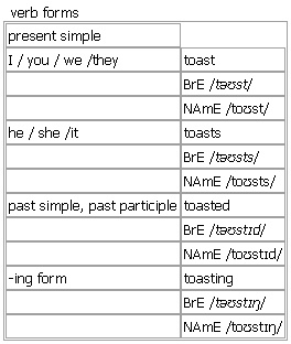 ▪ I. toast [toast toasts toasted toasting] noun, verb BrE [təʊst] NAmE [toʊst] noun 1. uncountable slices of bread that have been made brown and crisp by heating them on both sides in a ↑toaster or under a ↑grill •cheese on toast •a piece of toast •two slices/rounds of toast see also ↑French toast 2. countable ~ (to sb/sth) the act of a group of people wishing sb happiness, success, etc. by drinking a glass of sth, especially alcohol, at the same time •I'd like to propose a toast to the bride and groom. •The committee drank a toast to the new project. 3. singular the ~ of… a person who is praised by a lot of people in a particular place because of sth that they have done well •The performance made her the toast of the festival. Word Origin: late Middle English (as a verb in the sense ‘burn as the sun does, parch’): from Old French toster ‘roast’, from Latin torrere ‘parch’. The practice of drinking a toast goes back to the late 17th cent., and originated in naming a lady whose health the company was requested to drink, the idea being that the lady's name flavoured the drink like the pieces of spiced toast that were formerly placed in drinks such as wine. Example Bank: •He raised his glass as if to make a toast. •I can smell burned toast. •I'm making toast for breakfast. •She ate two slices of toast spread with honey. •The bridegroom ended his speech by proposing a toast to the hosts. •We'll have another round of toast, please. •buttered toast •I'd like to propose a toast to the bride and groom. verb 1. transitive ~ sb/sth to lift a glass of wine, etc. in the air and drink it at the same time as other people in order to wish sb/sth success, happiness, etc •The happy couple were toasted in champagne. •We toasted the success of the new company. 2. transitive, intransitive ~ (sth) to make sth, especially bread, turn brown by heating it in a ↑toaster or close to heat; to turn brown in this way •The buns should be served lightly toasted. •a toasted sandwich •Place under a hot grill until the nuts have toasted. 3. transitive ~ sth to warm a part of your body by placing it near a fire •He sat toasting his feet in front of the fire. Verb forms: Word Origin: late Middle English (as a verb in the sense ‘burn as the sun does, parch’): from Old French toster ‘roast’, from Latin torrere ‘parch’. The practice of drinking a toast goes back to the late 17th cent., and originated in naming a lady whose health the company was requested to drink, the idea being that the lady's name flavoured the drink like the pieces of spiced toast that were formerly placed in drinks such as wine. Collocations: Cooking Preparing prepare a dish/a meal/a menu/dinner/the fish weigh out 100g/4oz of sugar/the ingredients wash/rinse the lettuce/spinach/watercress chop/slice/dice the carrots/onions/potatoes peel the carrots/onion/potatoes/garlic/orange grate a carrot/the cheese/some nutmeg remove/discard the bones/seeds/skin blend/combine/mix (together) the flour and water/all the ingredients beat/whisk the cream/eggs/egg whites knead/shape/roll (out) the dough Cooking heat the oil in a frying pan preheat/heat the oven/(BrE) the grill/(NAmE) the broiler bring to (BrE) the boil/(NAmE) a boil stir constantly/gently with a wooden spoon reduce the heat simmer gently for 20 minutes/until reduced by half melt the butter/chocolate/cheese/sugar brown the meat for 8-20 minutes drain the pasta/the water from the pot/in a colander mash the potatoes/banana/avocado Ways of cooking cook food/fish/meat/rice/pasta/a Persian dish bake (a loaf of) bread/a cake/(especially NAmE) cookies/(BrE) biscuits/a pie/potatoes/fish/scones/muffins boil cabbage/potatoes/an egg/water fry/deep-fry/stir-fry the chicken/vegetables grill meat/steak/chicken/sausages/a hot dog roast potatoes/peppers/meat/chicken/lamb sauté garlic/mushrooms/onions/potatoes/vegetables steam rice/vegetables/spinach/asparagus/dumplings toast bread/nuts microwave food/popcorn/(BrE) a ready meal Serving serve in a glass/on a bed of rice/with potatoes arrange the slices on a plate/in a layer carve the meat/lamb/chicken/turkey dress/toss a salad dress with/drizzle with olive oil/vinaigrette top with a slice of lemon/a scoop of ice cream/whipped cream/syrup garnish with a sprig of parsley/fresh basil leaves/lemon wedges/a slice of lime/a twist of orange sprinkle with salt/sugar/herbs/parsley/freshly ground black pepper Example Bank: •He raised his glass, silently toasting his absent son. •Toast the bread lightly on both sides. •We toasted his victory in champagne. ▪ II. be ˈtoast idiom (informal, especially NAmE)to be likely to die or be destroyed •One mistake and you're toast. Main entry: ↑toastidiom