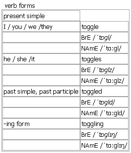 tog·gle [toggle toggles toggled toggling] noun, verb BrE [ˈtɒɡl] NAmE [ˈtɑːɡl] noun  1. a short piece of wood, plastic, etc. that is put through a ↑loop of thread to fasten sth, such as a coat or bag, instead of a button 2. (also ˈtoggle switch) (computing)a key on a computer that you press to change from one style or operation to another, and back again Word Origin: mid 18th cent. (originally in nautical use): of unknown origin. verb intransitive, transitive (computing) to press a key or set of keys on a computer keyboard in order to turn a feature on or off, or to move from one program, etc. to another •~ (between A and B) He toggled between the two windows. •~ sth This key toggles various views of the data. Verb forms: Word Origin: mid 18th cent. (originally in nautical use): of unknown origin. See also: ↑toggle switch